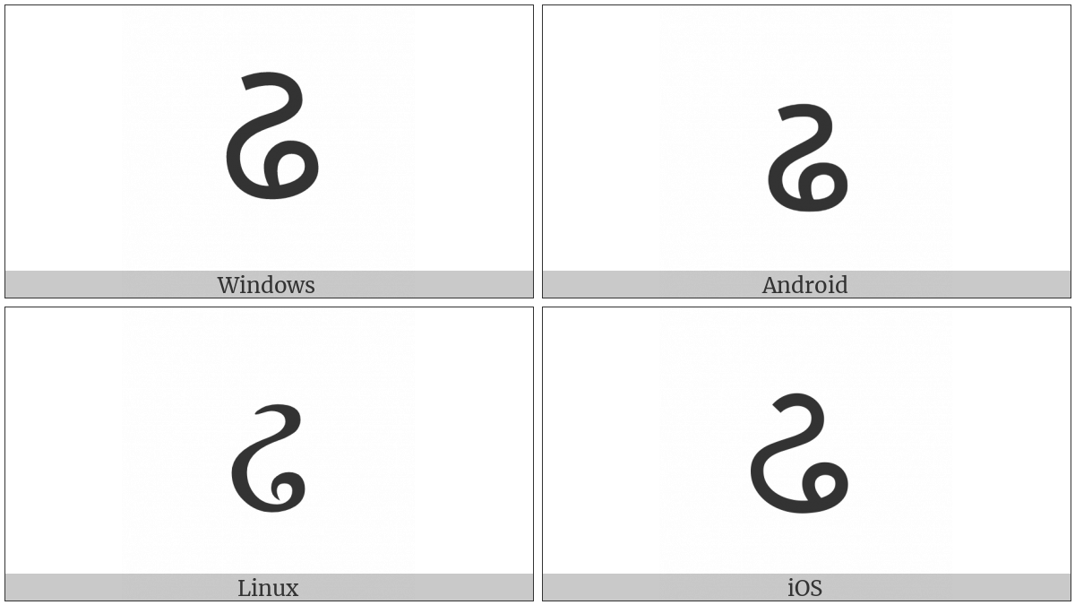 The image below shows how the “Gujarati Letter Ddha” symbol might look like on different operating systems. If the font in which this web site is displayed does not contain the symbol and there is no fallback font able to render it, you can use the image below to get an idea of what it should look like.