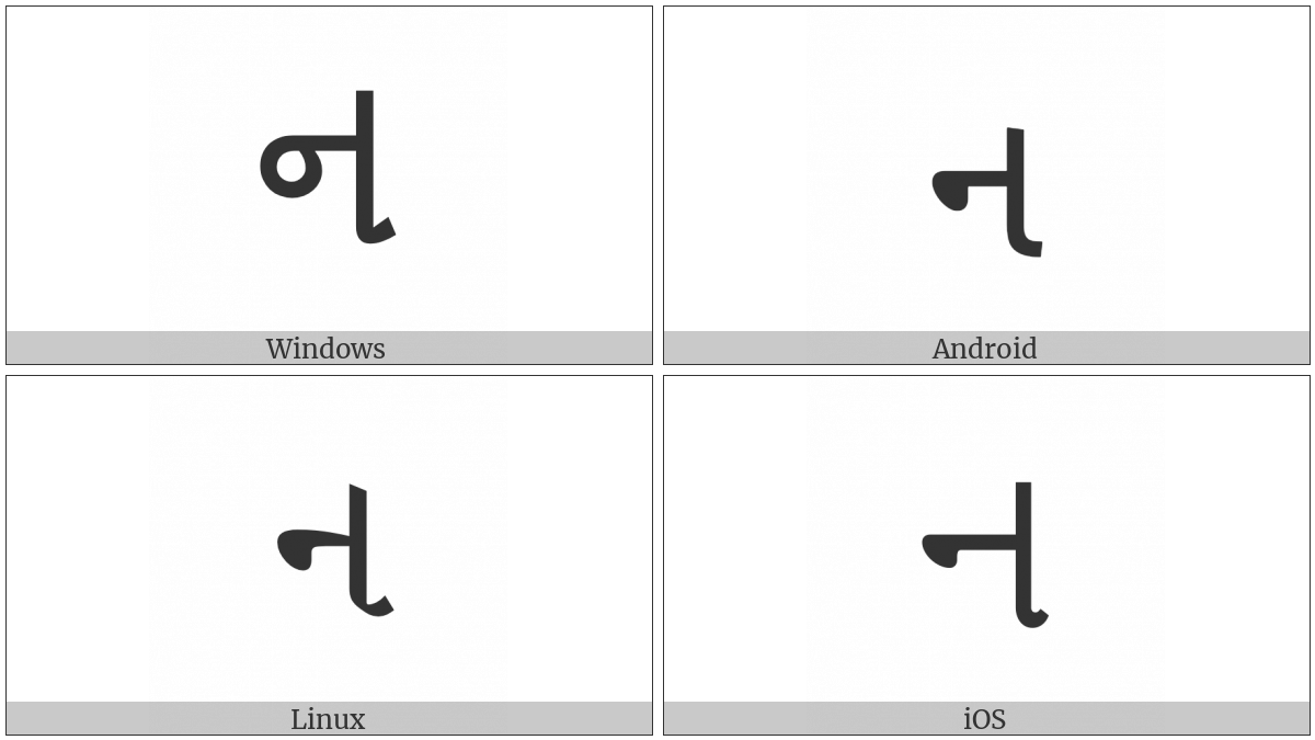 The image below shows how the “Gujarati Letter Na” symbol might look like on different operating systems. If the font in which this web site is displayed does not contain the symbol and there is no fallback font able to render it, you can use the image below to get an idea of what it should look like.
