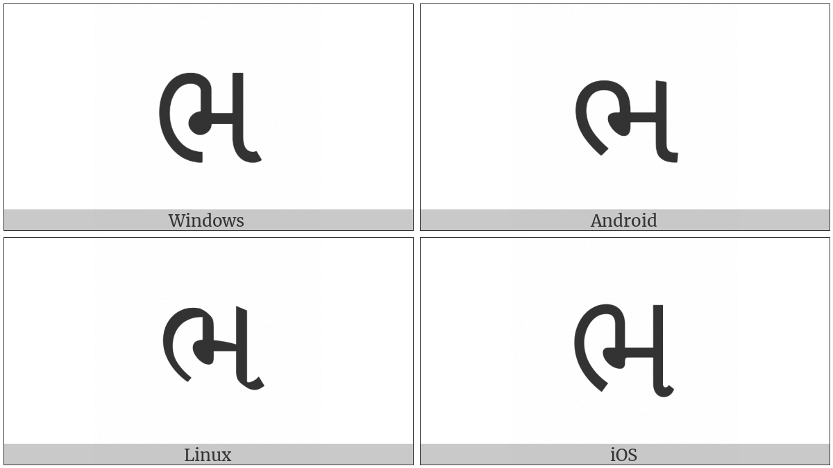 The image below shows how the “Gujarati Letter Bha” symbol might look like on different operating systems. If the font in which this web site is displayed does not contain the symbol and there is no fallback font able to render it, you can use the image below to get an idea of what it should look like.