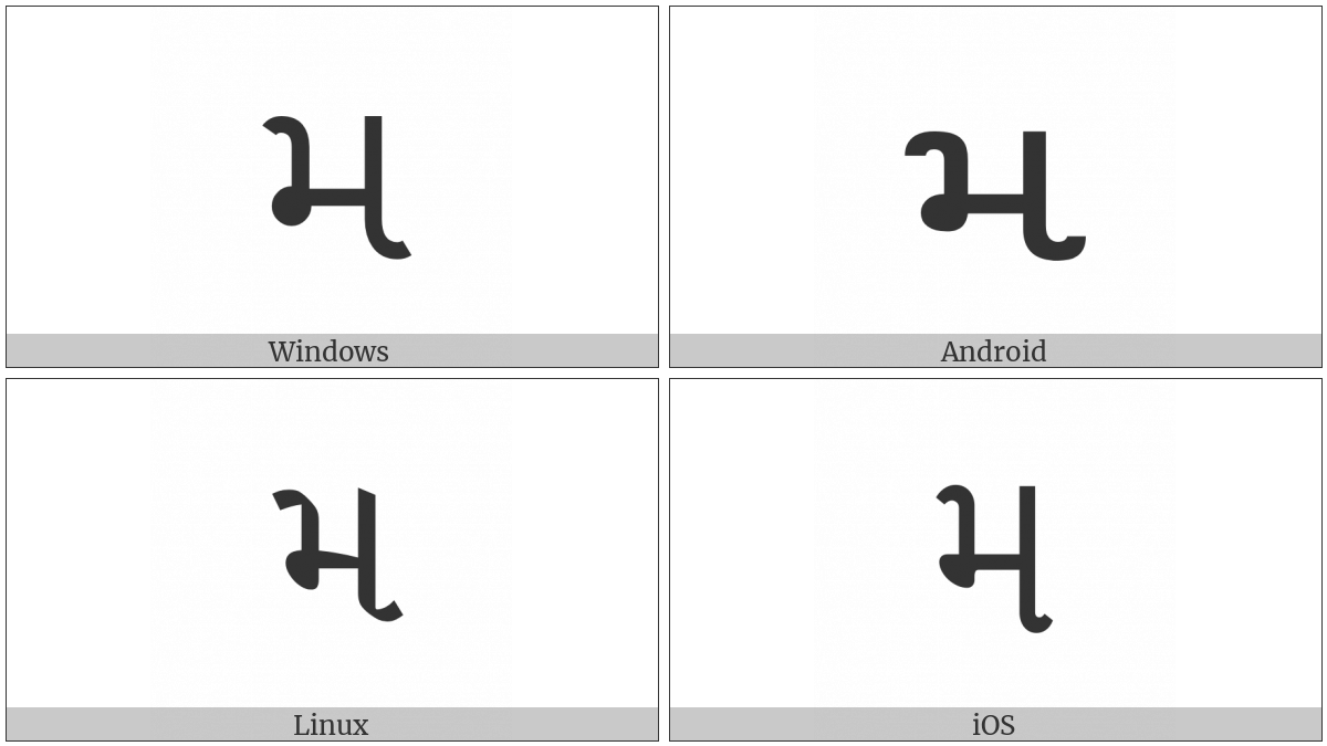 The image below shows how the “Gujarati Letter Ma” symbol might look like on different operating systems. If the font in which this web site is displayed does not contain the symbol and there is no fallback font able to render it, you can use the image below to get an idea of what it should look like.