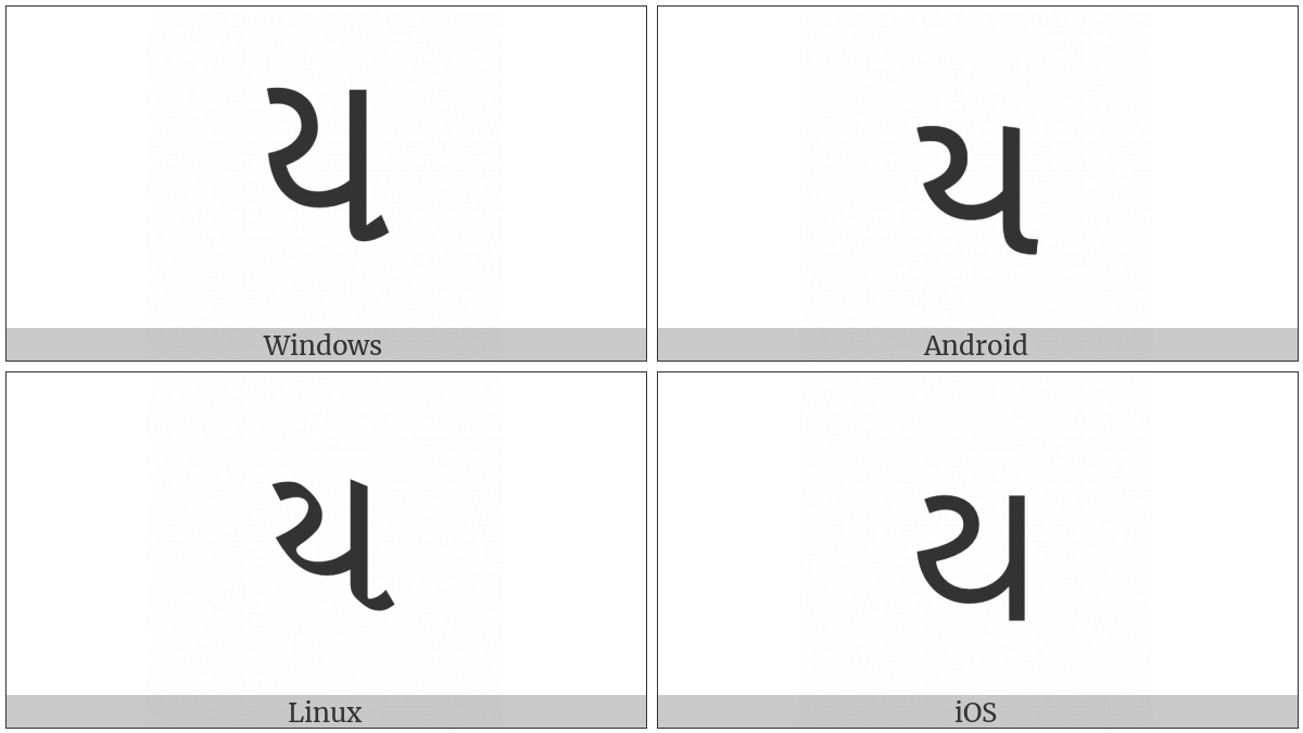 The image below shows how the “Gujarati Letter Ya” symbol might look like on different operating systems. If the font in which this web site is displayed does not contain the symbol and there is no fallback font able to render it, you can use the image below to get an idea of what it should look like.