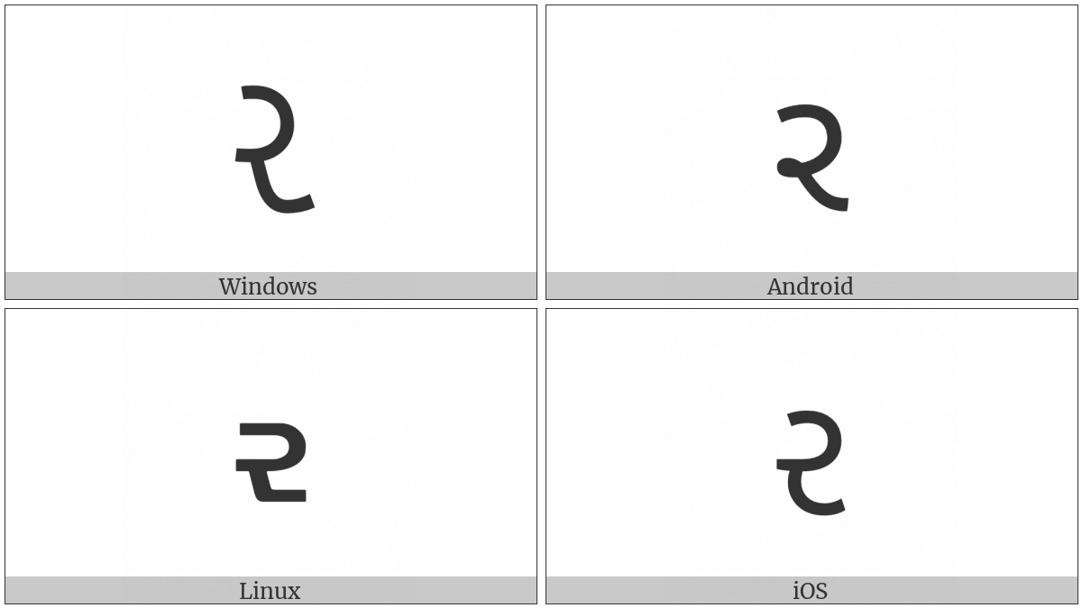 The image below shows how the “Gujarati Letter Ra” symbol might look like on different operating systems. If the font in which this web site is displayed does not contain the symbol and there is no fallback font able to render it, you can use the image below to get an idea of what it should look like.