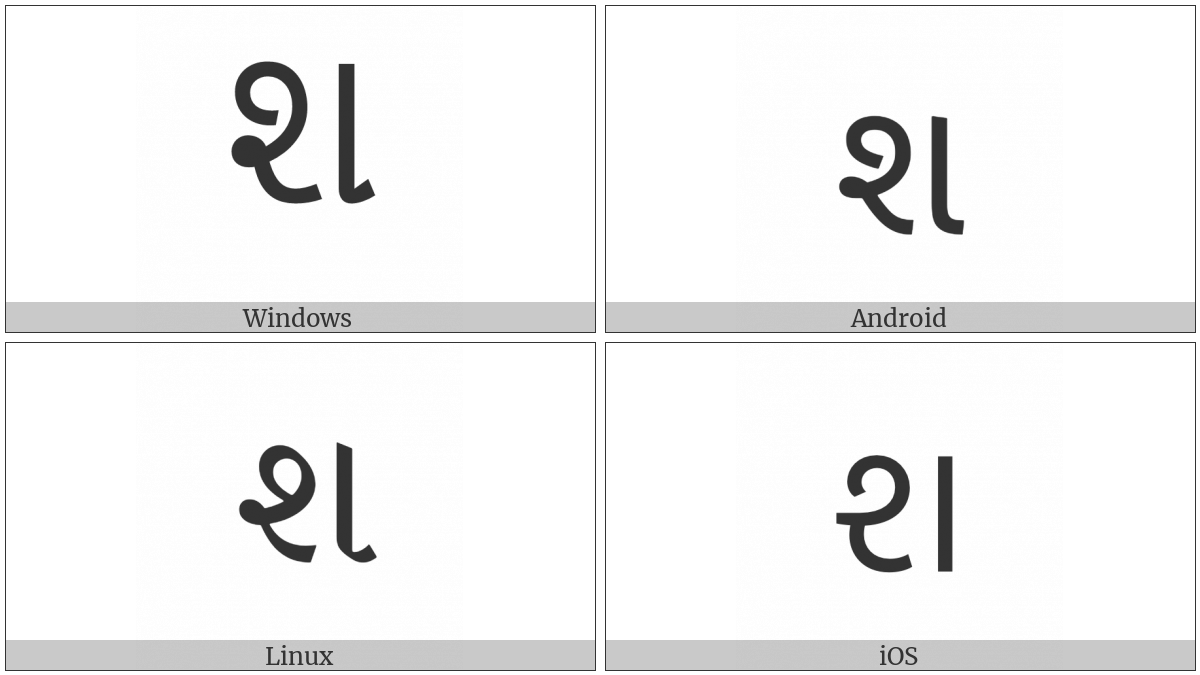 The image below shows how the “Gujarati Letter Sha” symbol might look like on different operating systems. If the font in which this web site is displayed does not contain the symbol and there is no fallback font able to render it, you can use the image below to get an idea of what it should look like.