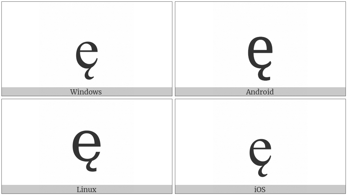 The image below shows how the “Latin Small Letter E With Ogonek” symbol might look like on different operating systems. If the font in which this web site is displayed does not contain the symbol and there is no fallback font able to render it, you can use the image below to get an idea of what it should look like.