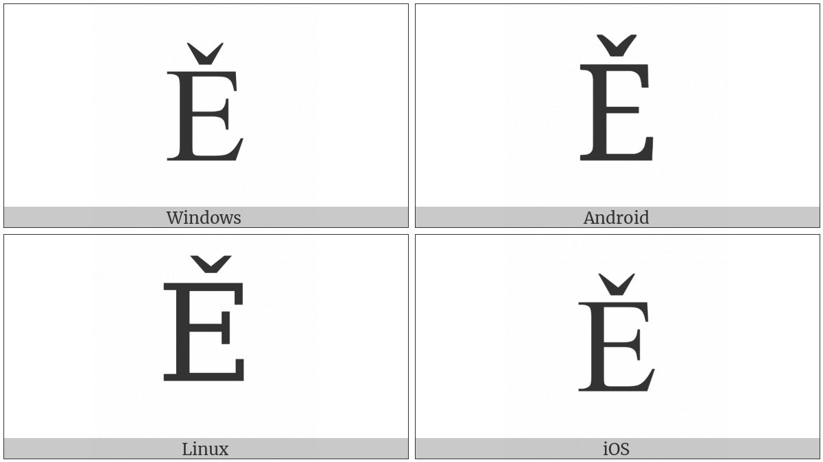The image below shows how the “Latin Capital Letter E With Caron” symbol might look like on different operating systems. If the font in which this web site is displayed does not contain the symbol and there is no fallback font able to render it, you can use the image below to get an idea of what it should look like.