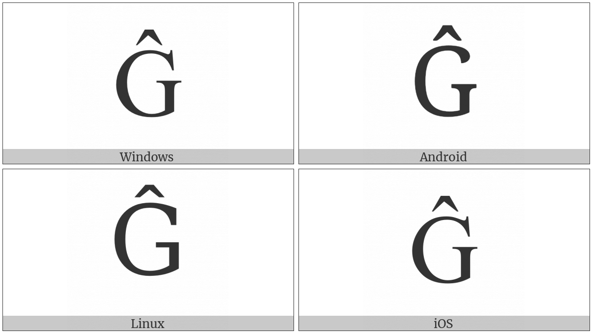 The image below shows how the “Latin Capital Letter G With Circumflex” symbol might look like on different operating systems. If the font in which this web site is displayed does not contain the symbol and there is no fallback font able to render it, you can use the image below to get an idea of what it should look like.