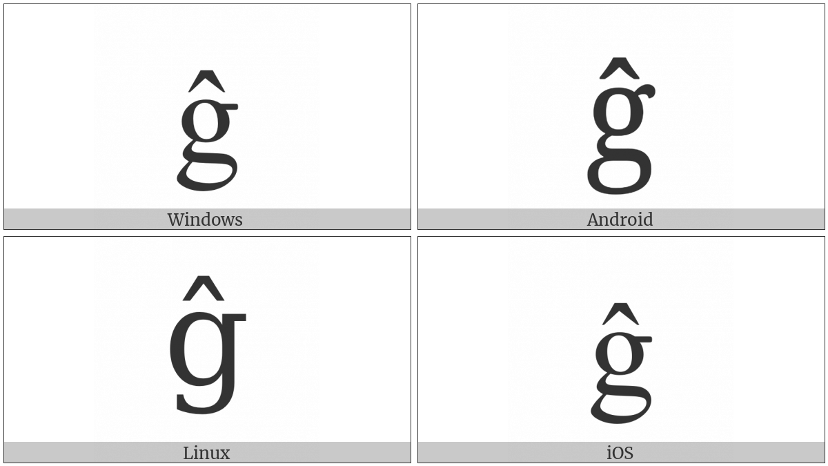 The image below shows how the “Latin Small Letter G With Circumflex” symbol might look like on different operating systems. If the font in which this web site is displayed does not contain the symbol and there is no fallback font able to render it, you can use the image below to get an idea of what it should look like.