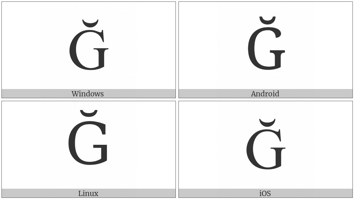 The image below shows how the “Latin Capital Letter G With Breve” symbol might look like on different operating systems. If the font in which this web site is displayed does not contain the symbol and there is no fallback font able to render it, you can use the image below to get an idea of what it should look like.