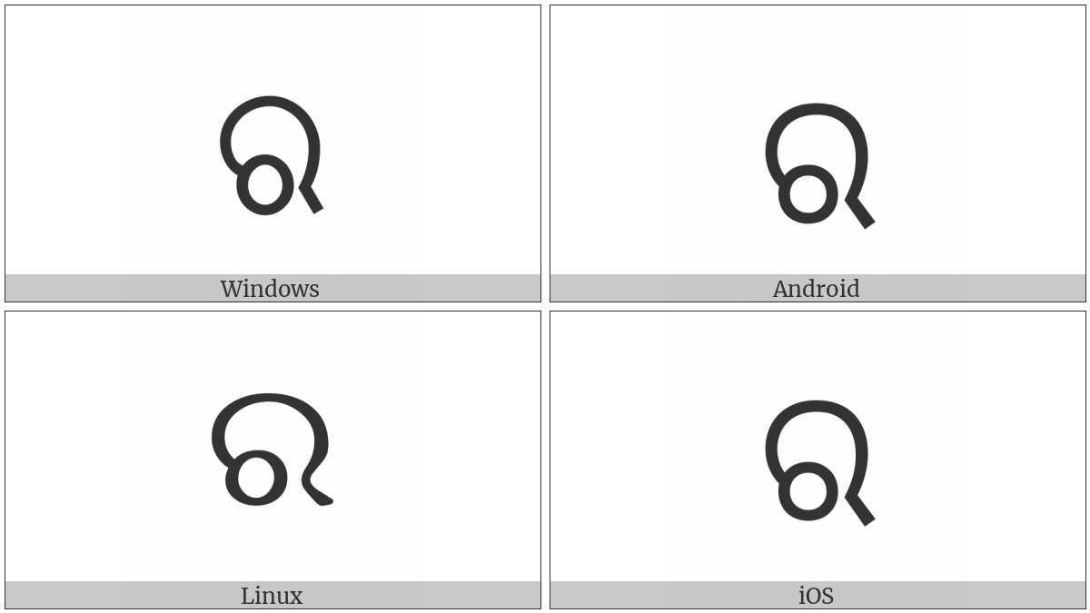 The image below shows how the “Oriya Letter Ra” symbol might look like on different operating systems. If the font in which this web site is displayed does not contain the symbol and there is no fallback font able to render it, you can use the image below to get an idea of what it should look like.