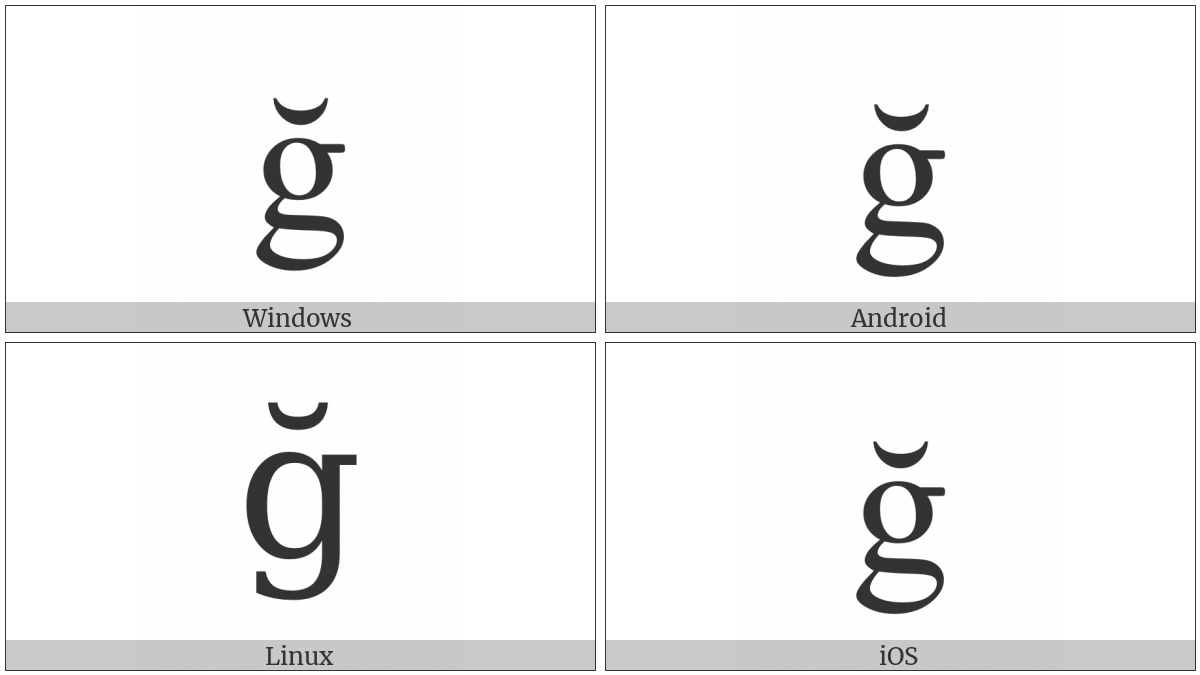The image below shows how the “Latin Small Letter G With Breve” symbol might look like on different operating systems. If the font in which this web site is displayed does not contain the symbol and there is no fallback font able to render it, you can use the image below to get an idea of what it should look like.