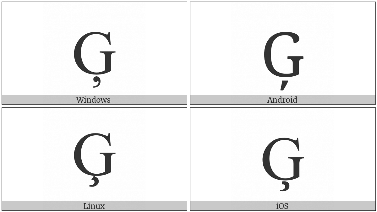 The image below shows how the “Latin Capital Letter G With Cedilla” symbol might look like on different operating systems. If the font in which this web site is displayed does not contain the symbol and there is no fallback font able to render it, you can use the image below to get an idea of what it should look like.