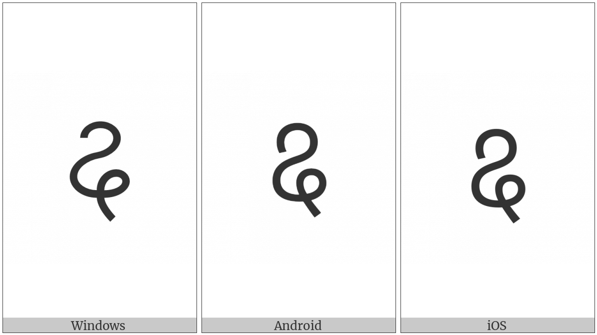 The image below shows how the “Oriya Letter Vocalic Ll” symbol might look like on different operating systems. If the font in which this web site is displayed does not contain the symbol and there is no fallback font able to render it, you can use the image below to get an idea of what it should look like.