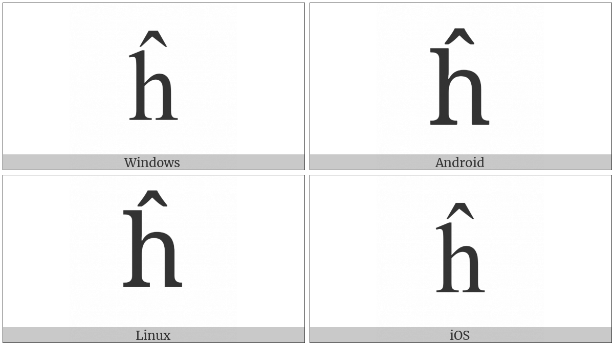 The image below shows how the “Latin Small Letter H With Circumflex” symbol might look like on different operating systems. If the font in which this web site is displayed does not contain the symbol and there is no fallback font able to render it, you can use the image below to get an idea of what it should look like.