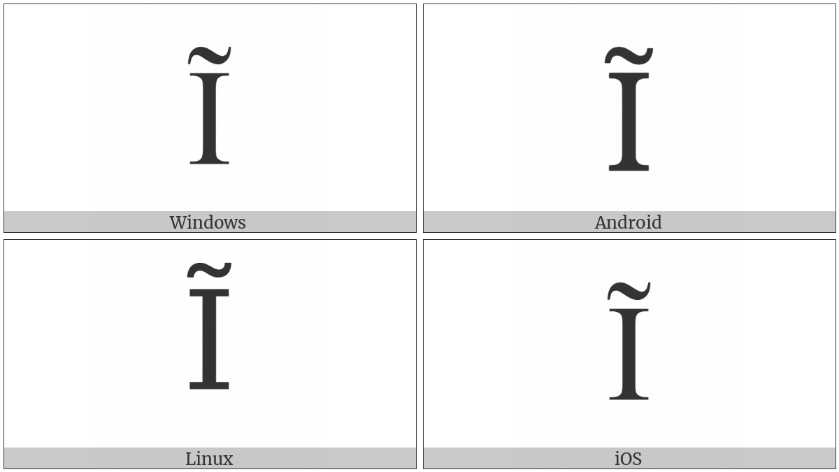 The image below shows how the “Latin Capital Letter I With Tilde” symbol might look like on different operating systems. If the font in which this web site is displayed does not contain the symbol and there is no fallback font able to render it, you can use the image below to get an idea of what it should look like.