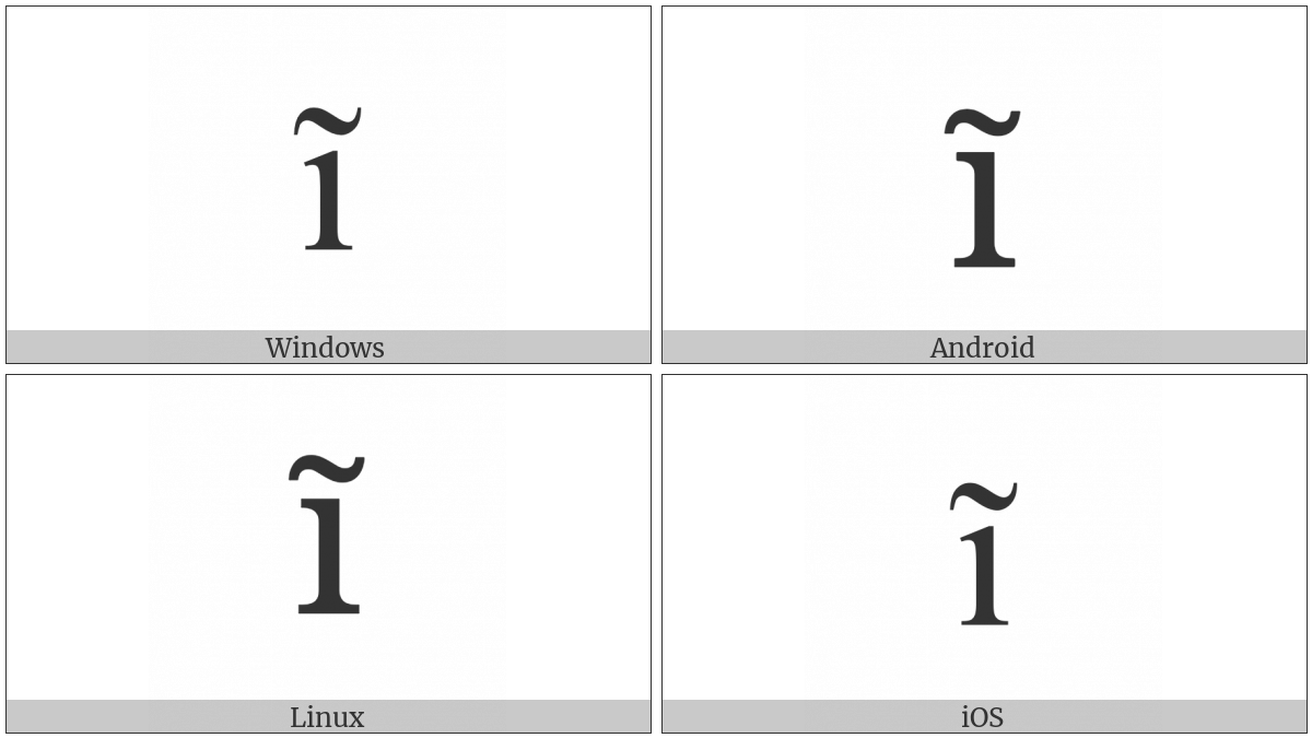 The image below shows how the “Latin Small Letter I With Tilde” symbol might look like on different operating systems. If the font in which this web site is displayed does not contain the symbol and there is no fallback font able to render it, you can use the image below to get an idea of what it should look like.