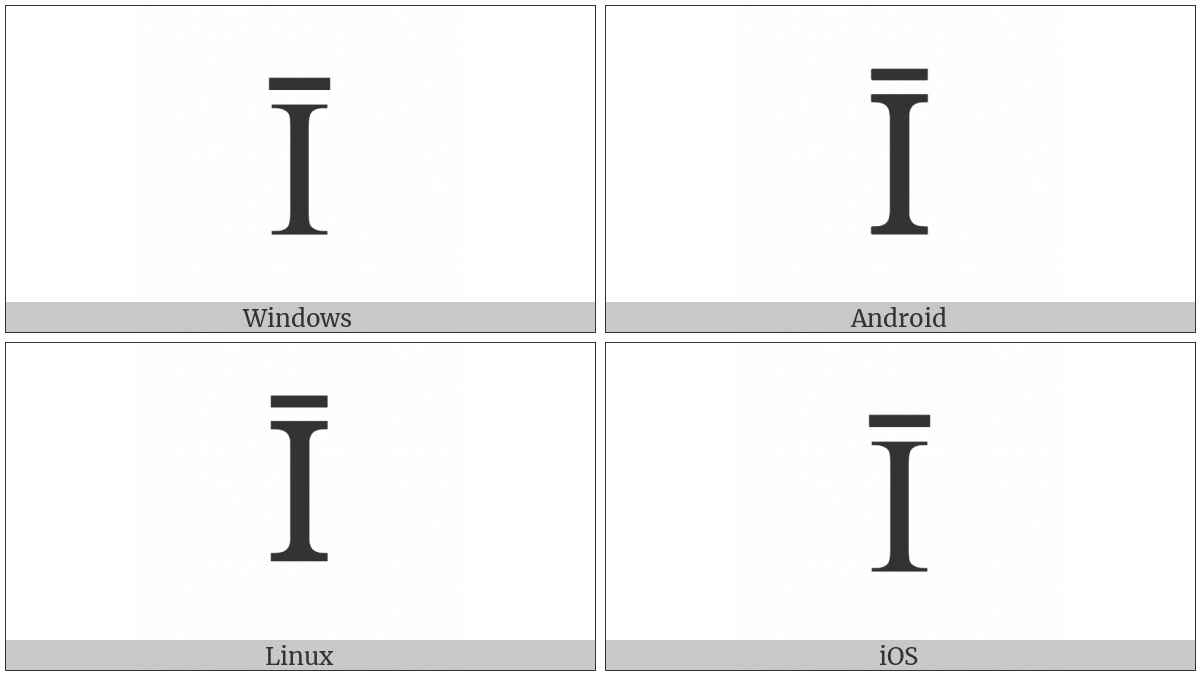 The image below shows how the “Latin Capital Letter I With Macron” symbol might look like on different operating systems. If the font in which this web site is displayed does not contain the symbol and there is no fallback font able to render it, you can use the image below to get an idea of what it should look like.