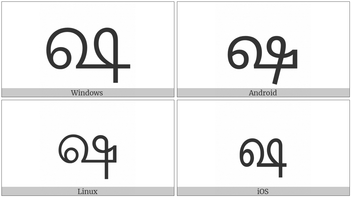 The image below shows how the “Tamil Letter Ssa” symbol might look like on different operating systems. If the font in which this web site is displayed does not contain the symbol and there is no fallback font able to render it, you can use the image below to get an idea of what it should look like.