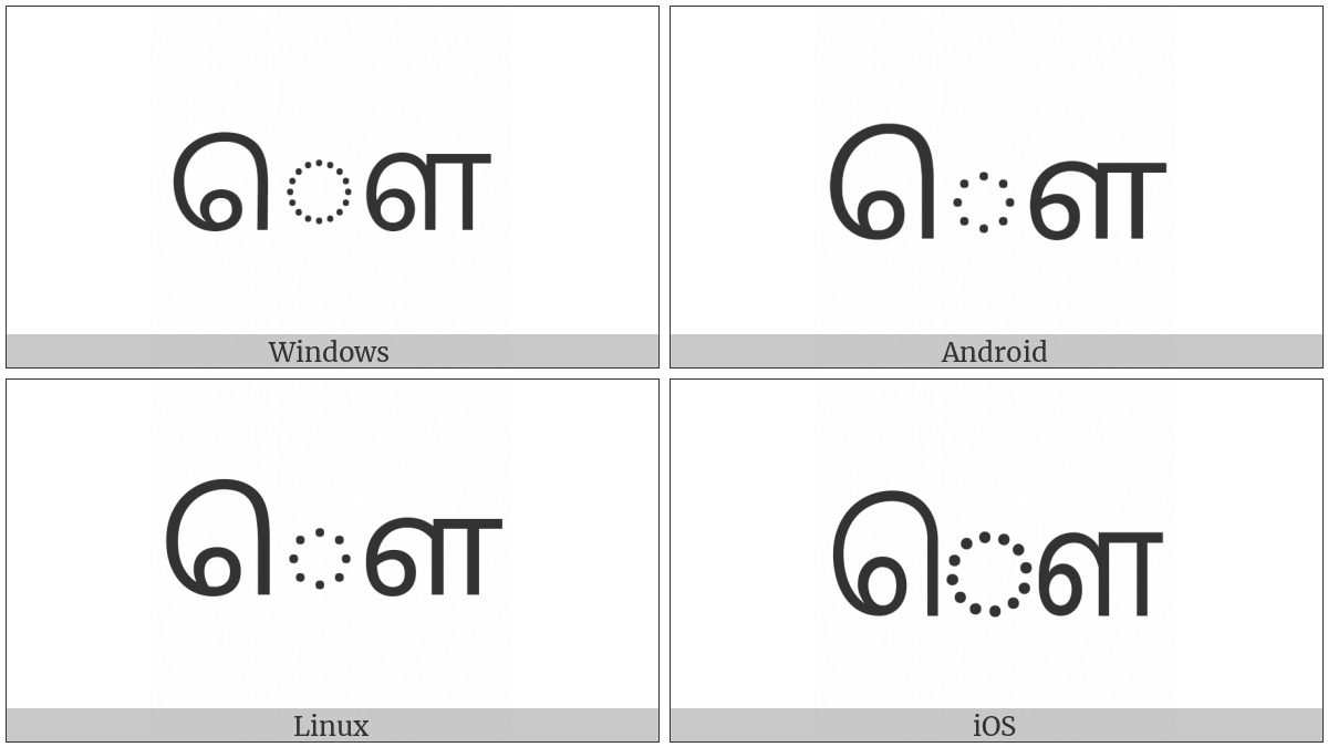The image below shows how the “Tamil Vowel Sign Au” symbol might look like on different operating systems. If the font in which this web site is displayed does not contain the symbol and there is no fallback font able to render it, you can use the image below to get an idea of what it should look like.