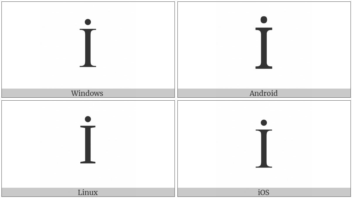 The image below shows how the “Latin Capital Letter I With Dot Above” symbol might look like on different operating systems. If the font in which this web site is displayed does not contain the symbol and there is no fallback font able to render it, you can use the image below to get an idea of what it should look like.