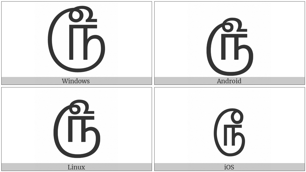 The image below shows how the “Tamil Rupee Sign” symbol might look like on different operating systems. If the font in which this web site is displayed does not contain the symbol and there is no fallback font able to render it, you can use the image below to get an idea of what it should look like.