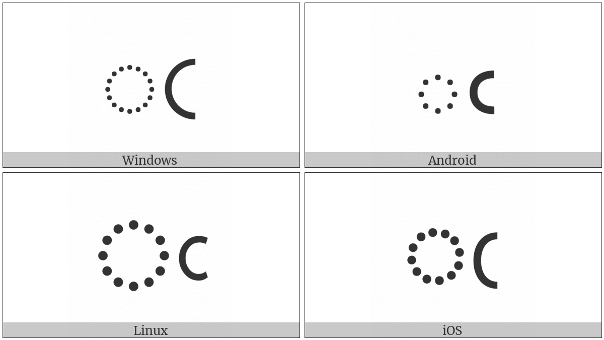 The image below shows how the “Telugu Sign Candrabindu” symbol might look like on different operating systems. If the font in which this web site is displayed does not contain the symbol and there is no fallback font able to render it, you can use the image below to get an idea of what it should look like.