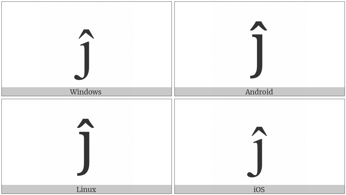 The image below shows how the “Latin Small Letter J With Circumflex” symbol might look like on different operating systems. If the font in which this web site is displayed does not contain the symbol and there is no fallback font able to render it, you can use the image below to get an idea of what it should look like.
