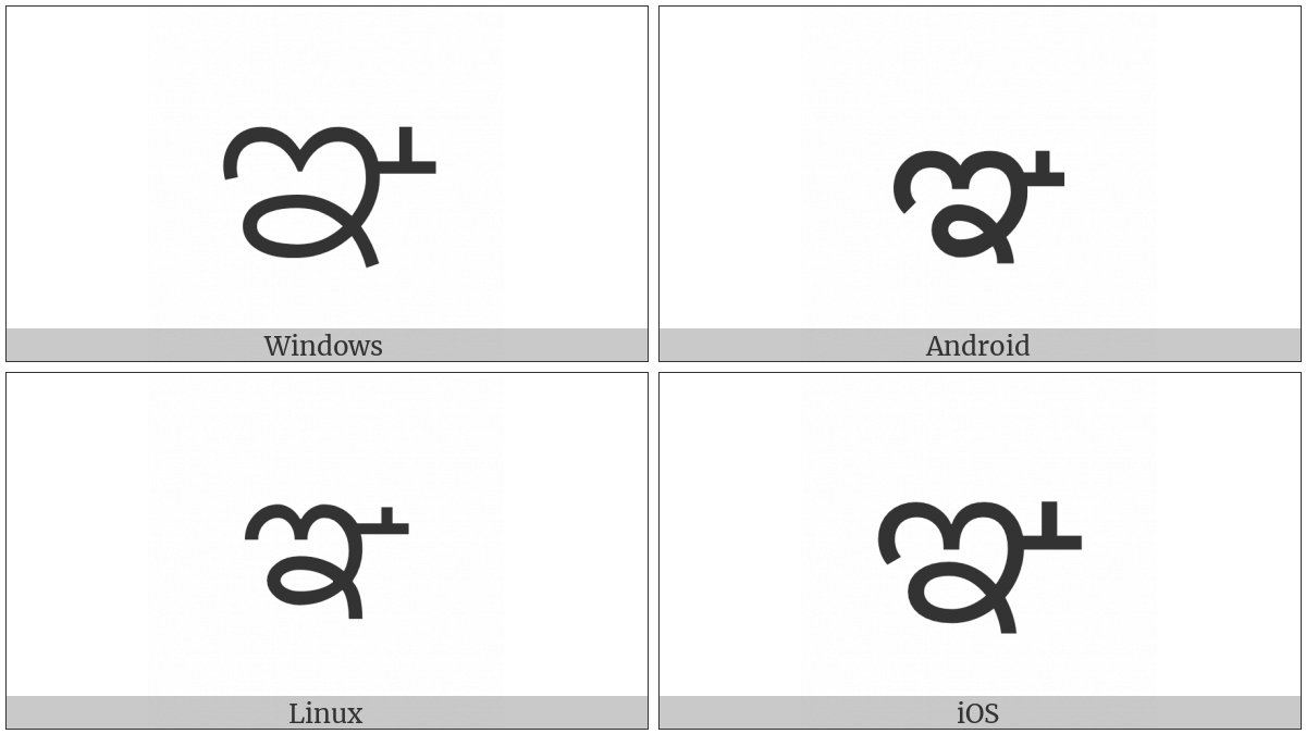 The image below shows how the “Telugu Letter Nya” symbol might look like on different operating systems. If the font in which this web site is displayed does not contain the symbol and there is no fallback font able to render it, you can use the image below to get an idea of what it should look like.