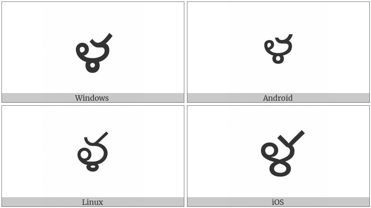 The image below shows how the “Telugu Letter Lla” symbol might look like on different operating systems. If the font in which this web site is displayed does not contain the symbol and there is no fallback font able to render it, you can use the image below to get an idea of what it should look like.