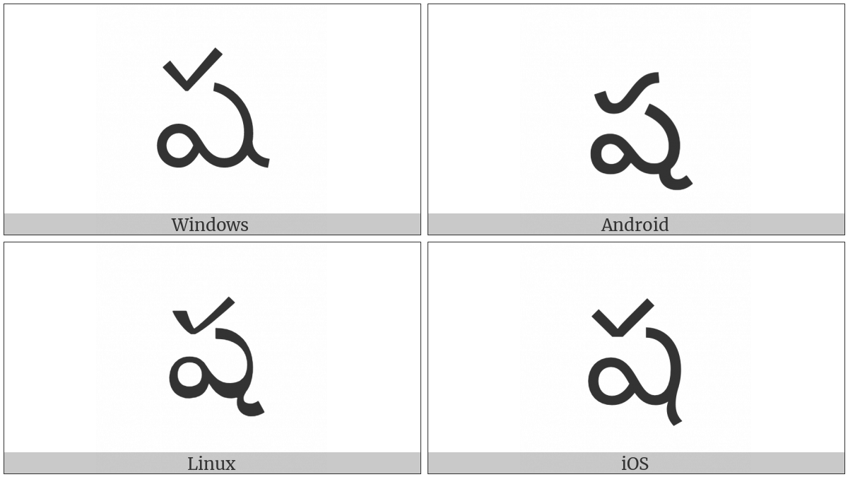 The image below shows how the “Telugu Letter Ssa” symbol might look like on different operating systems. If the font in which this web site is displayed does not contain the symbol and there is no fallback font able to render it, you can use the image below to get an idea of what it should look like.