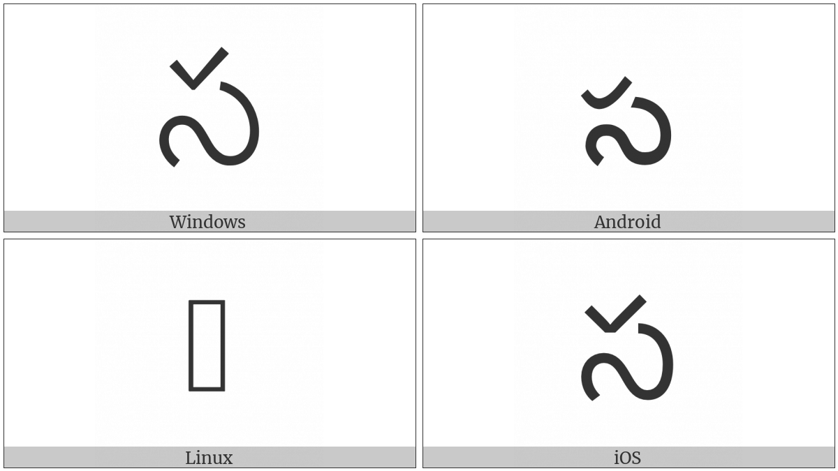 The image below shows how the “Telugu Letter Sa” symbol might look like on different operating systems. If the font in which this web site is displayed does not contain the symbol and there is no fallback font able to render it, you can use the image below to get an idea of what it should look like.