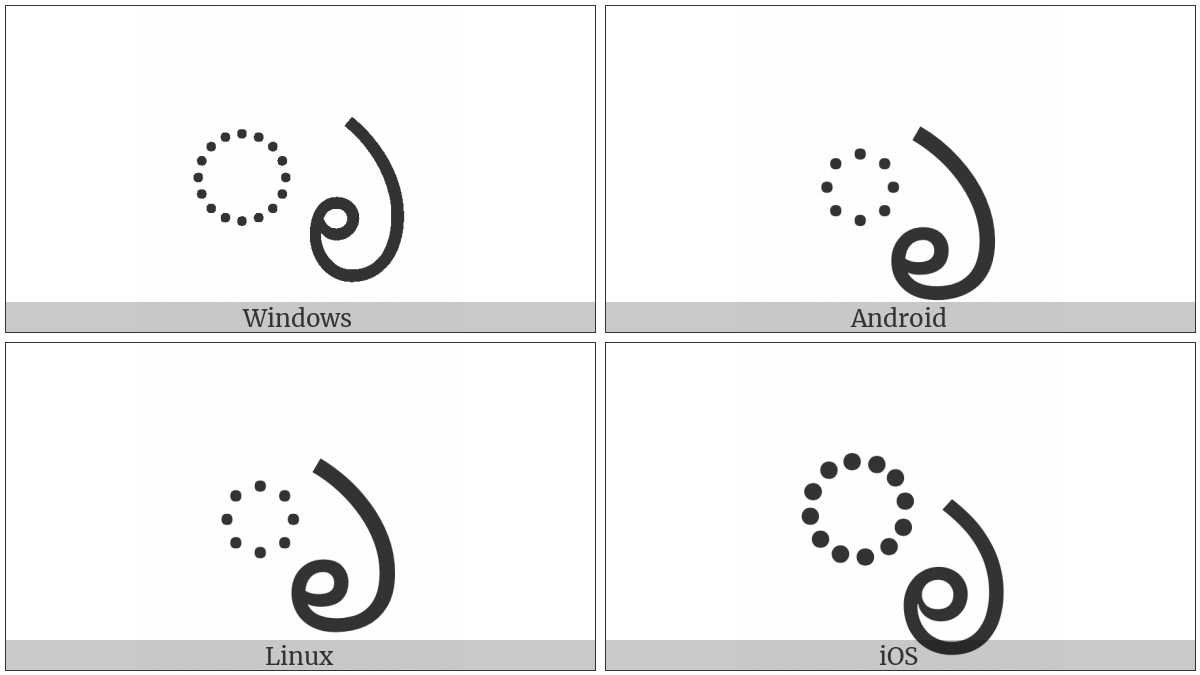 The image below shows how the “Telugu Vowel Sign Vocalic R” symbol might look like on different operating systems. If the font in which this web site is displayed does not contain the symbol and there is no fallback font able to render it, you can use the image below to get an idea of what it should look like.