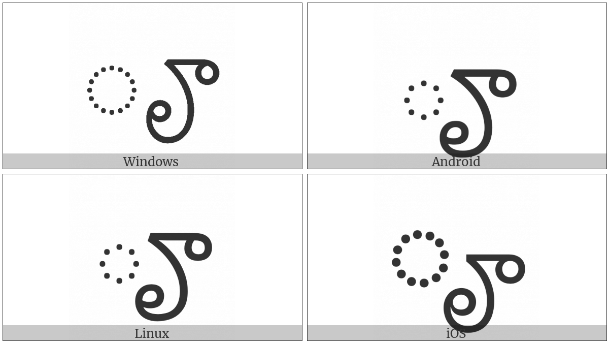 The image below shows how the “Telugu Vowel Sign Vocalic Rr” symbol might look like on different operating systems. If the font in which this web site is displayed does not contain the symbol and there is no fallback font able to render it, you can use the image below to get an idea of what it should look like.
