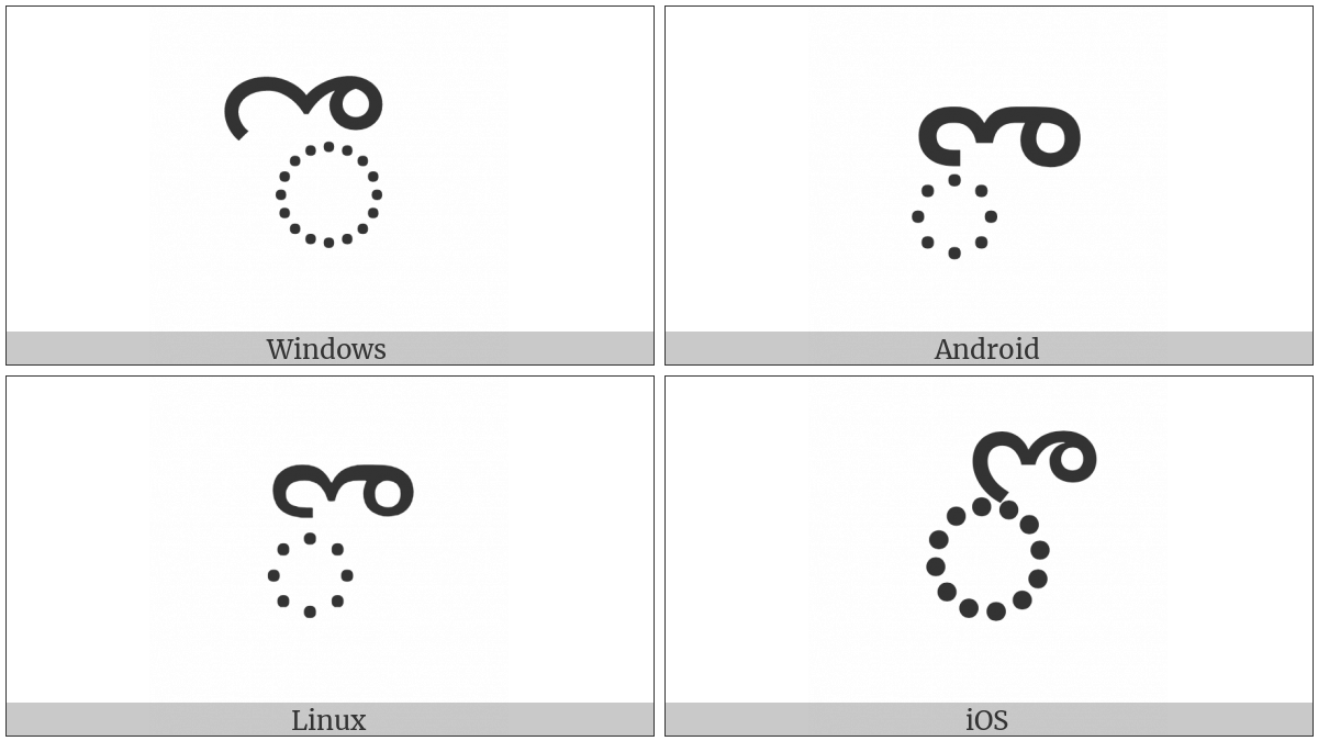 The image below shows how the “Telugu Vowel Sign O” symbol might look like on different operating systems. If the font in which this web site is displayed does not contain the symbol and there is no fallback font able to render it, you can use the image below to get an idea of what it should look like.