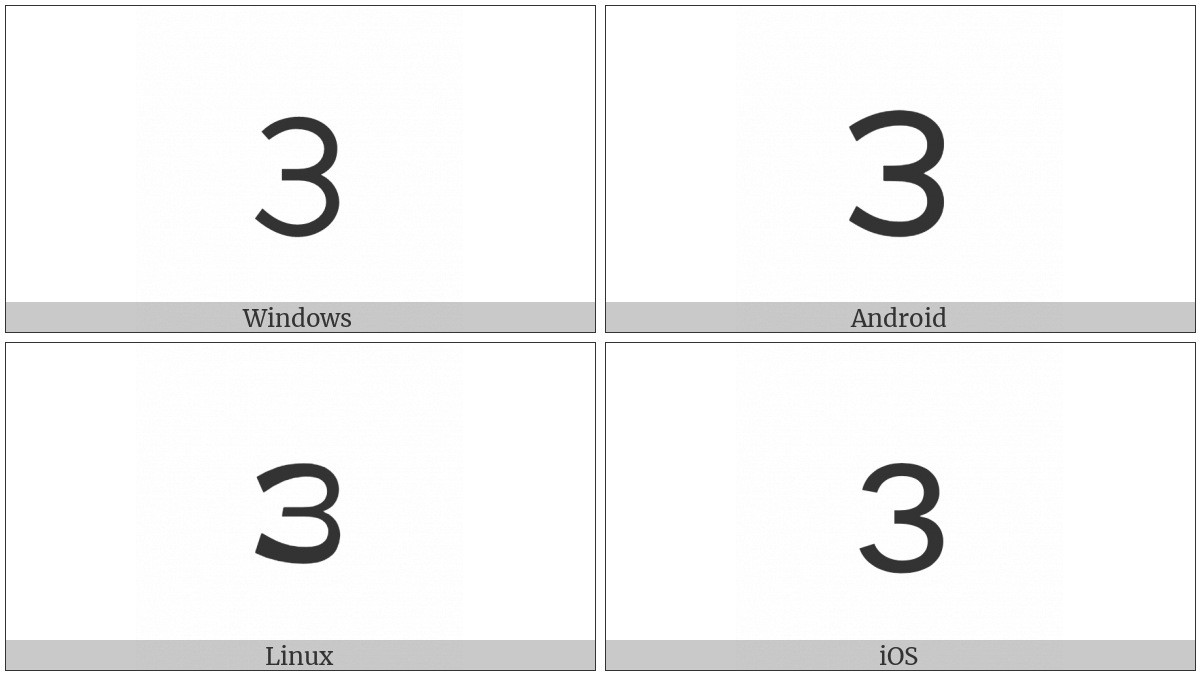 The image below shows how the “Telugu Digit Three” symbol might look like on different operating systems. If the font in which this web site is displayed does not contain the symbol and there is no fallback font able to render it, you can use the image below to get an idea of what it should look like.