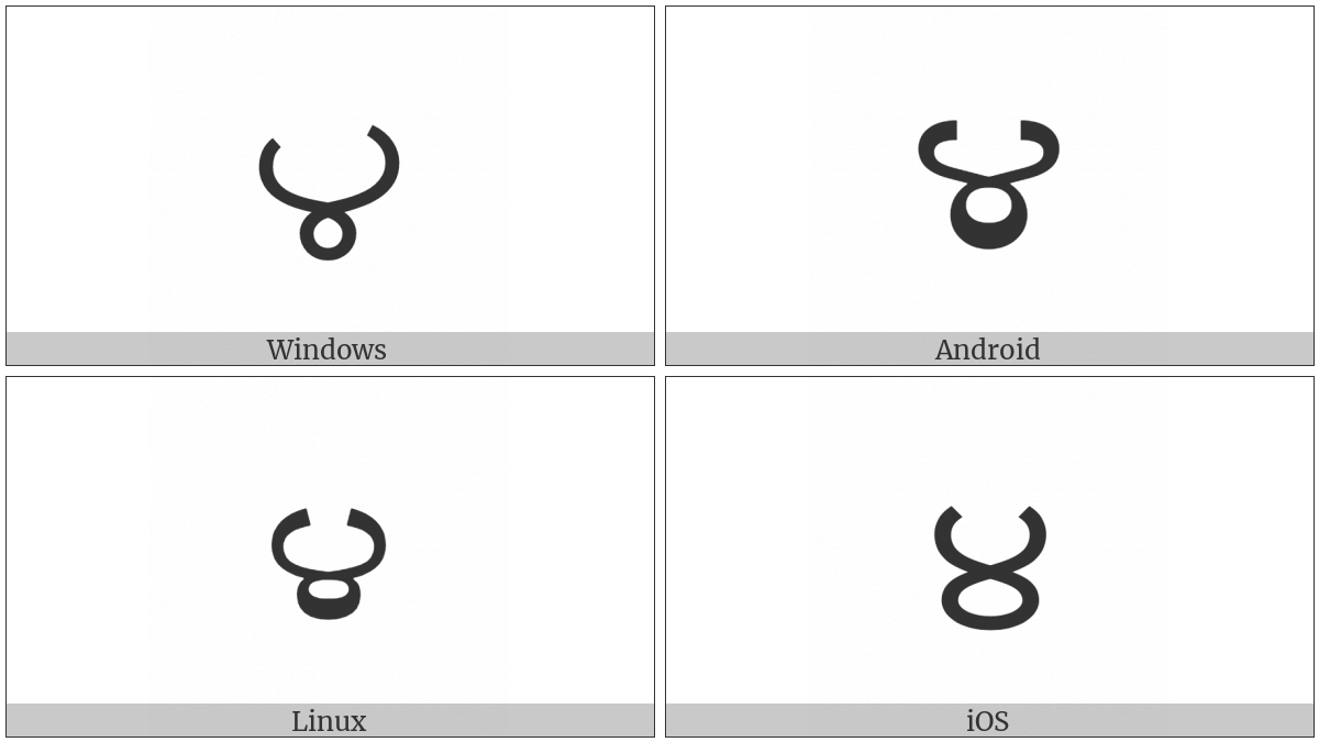 The image below shows how the “Telugu Digit Four” symbol might look like on different operating systems. If the font in which this web site is displayed does not contain the symbol and there is no fallback font able to render it, you can use the image below to get an idea of what it should look like.