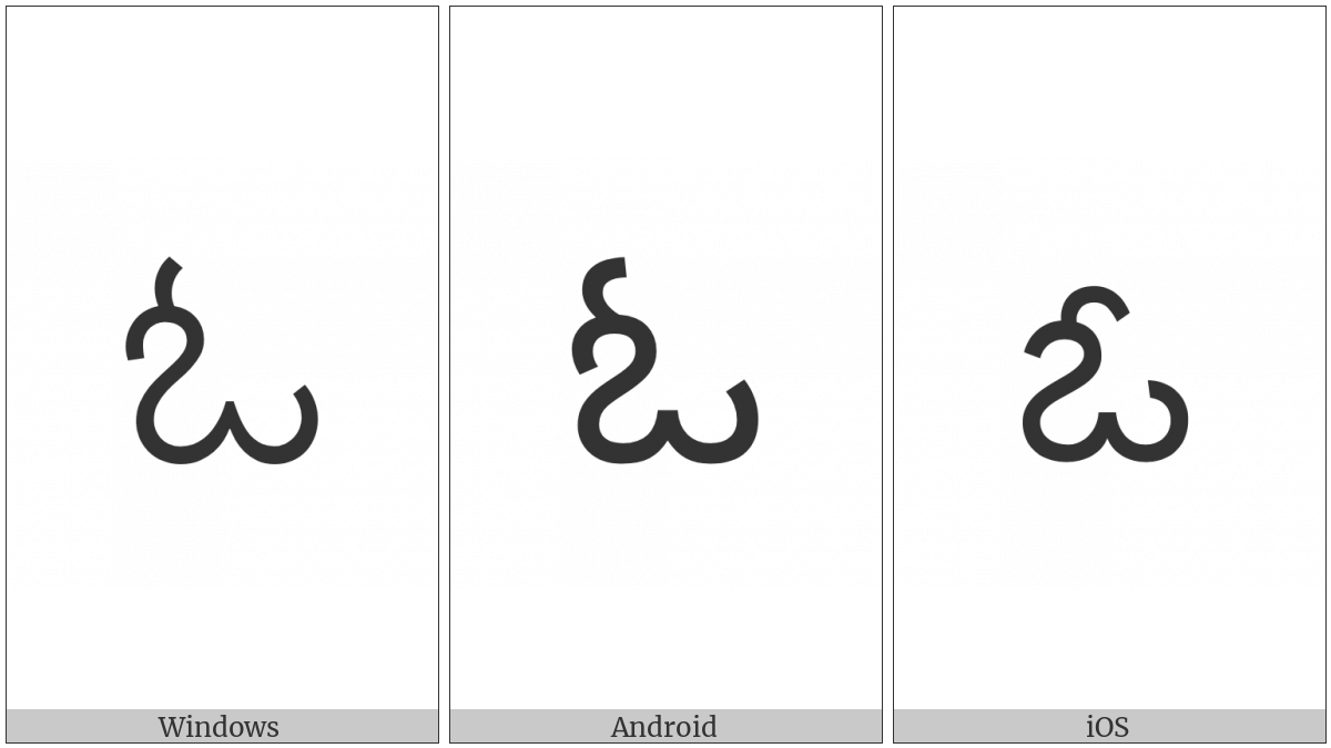 The image below shows how the “Kannada Letter Oo” symbol might look like on different operating systems. If the font in which this web site is displayed does not contain the symbol and there is no fallback font able to render it, you can use the image below to get an idea of what it should look like.