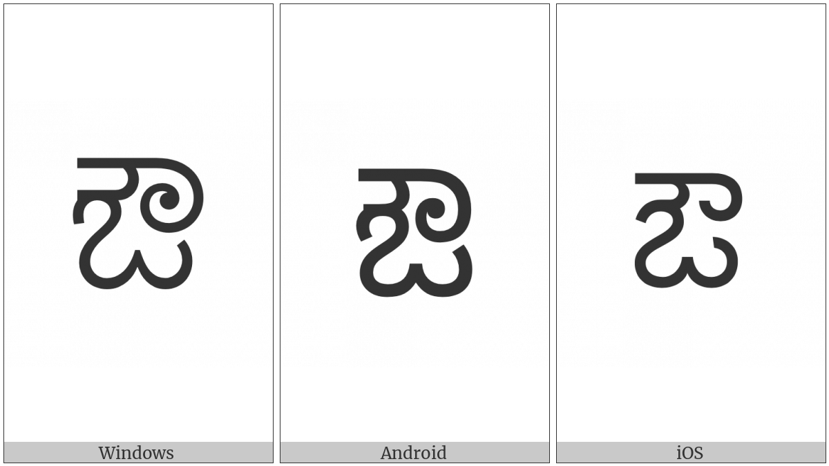 The image below shows how the “Kannada Letter Au” symbol might look like on different operating systems. If the font in which this web site is displayed does not contain the symbol and there is no fallback font able to render it, you can use the image below to get an idea of what it should look like.