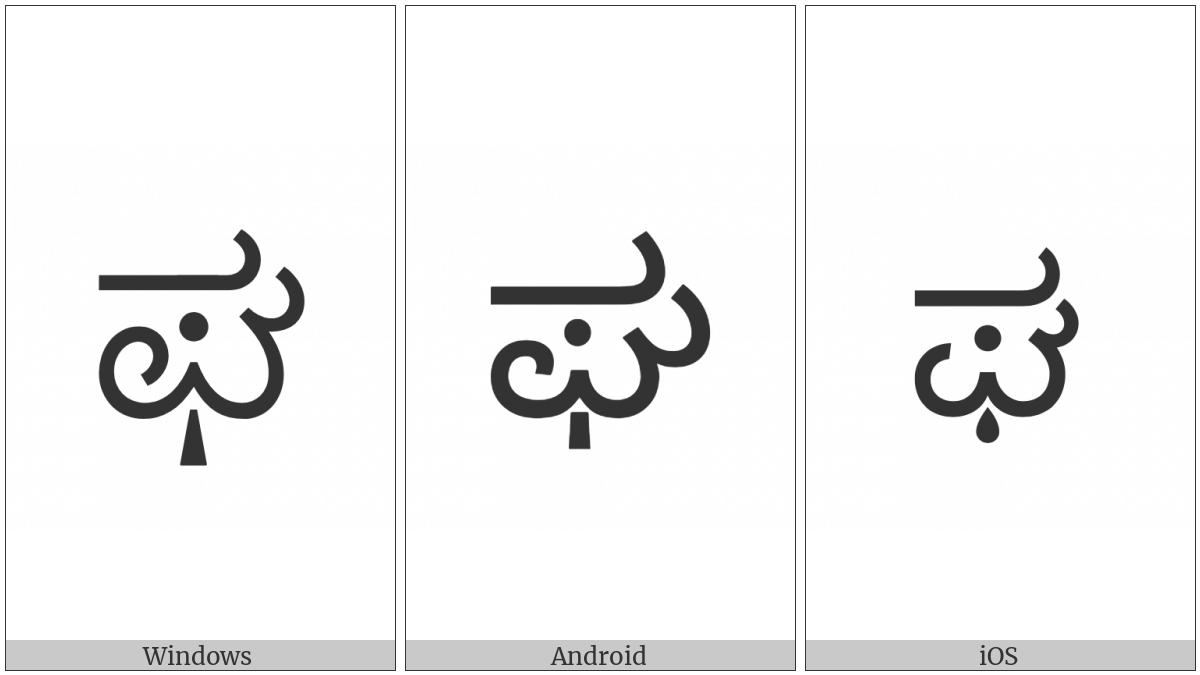 The image below shows how the “Kannada Letter Gha” symbol might look like on different operating systems. If the font in which this web site is displayed does not contain the symbol and there is no fallback font able to render it, you can use the image below to get an idea of what it should look like.