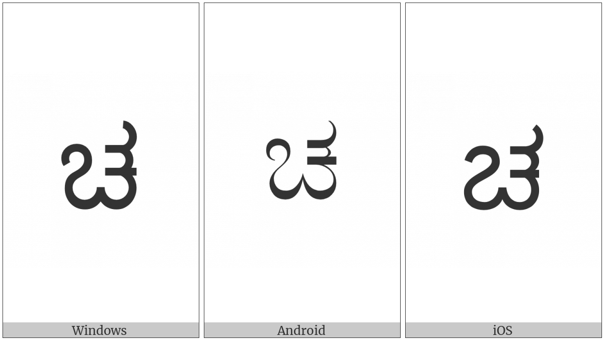 The image below shows how the “Kannada Letter Ca” symbol might look like on different operating systems. If the font in which this web site is displayed does not contain the symbol and there is no fallback font able to render it, you can use the image below to get an idea of what it should look like.