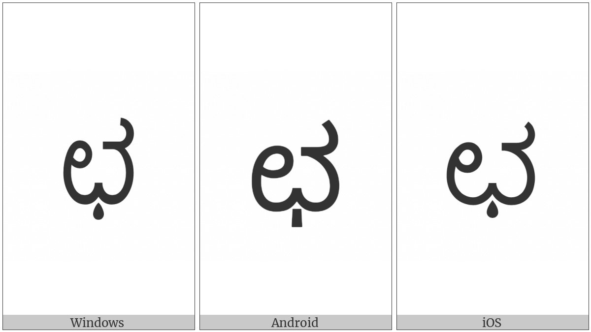 The image below shows how the “Kannada Letter Cha” symbol might look like on different operating systems. If the font in which this web site is displayed does not contain the symbol and there is no fallback font able to render it, you can use the image below to get an idea of what it should look like.