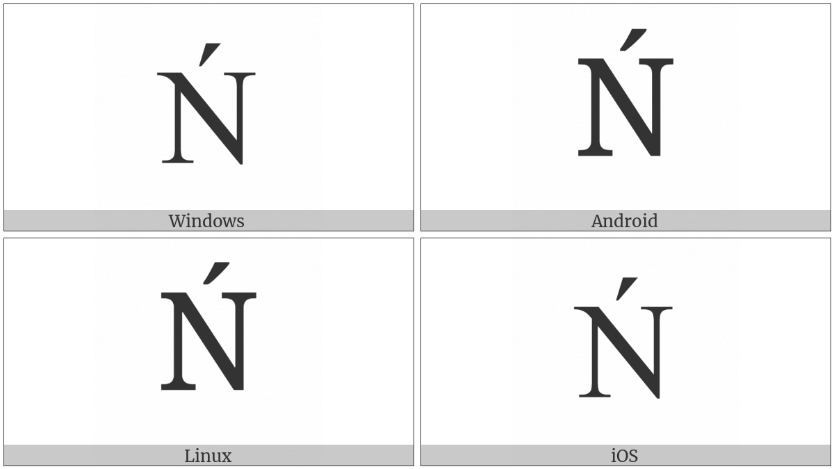 The image below shows how the “Latin Capital Letter N With Acute” symbol might look like on different operating systems. If the font in which this web site is displayed does not contain the symbol and there is no fallback font able to render it, you can use the image below to get an idea of what it should look like.