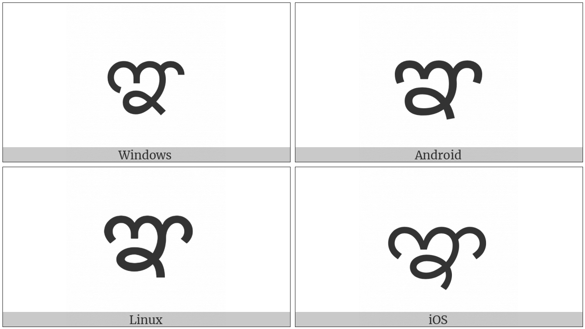The image below shows how the “Kannada Letter Nya” symbol might look like on different operating systems. If the font in which this web site is displayed does not contain the symbol and there is no fallback font able to render it, you can use the image below to get an idea of what it should look like.