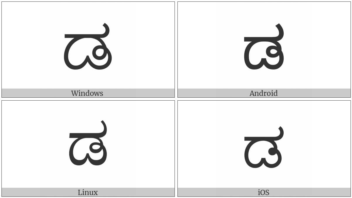 The image below shows how the “Kannada Letter Dda” symbol might look like on different operating systems. If the font in which this web site is displayed does not contain the symbol and there is no fallback font able to render it, you can use the image below to get an idea of what it should look like.
