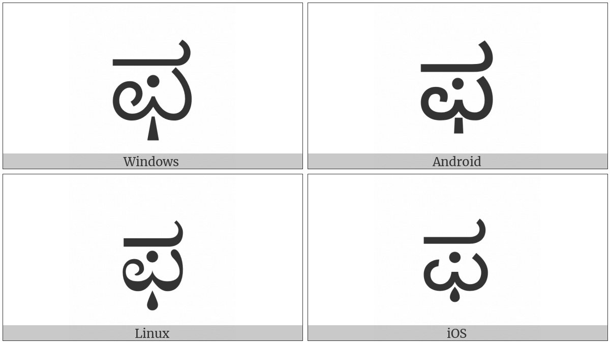 The image below shows how the “Kannada Letter Pha” symbol might look like on different operating systems. If the font in which this web site is displayed does not contain the symbol and there is no fallback font able to render it, you can use the image below to get an idea of what it should look like.