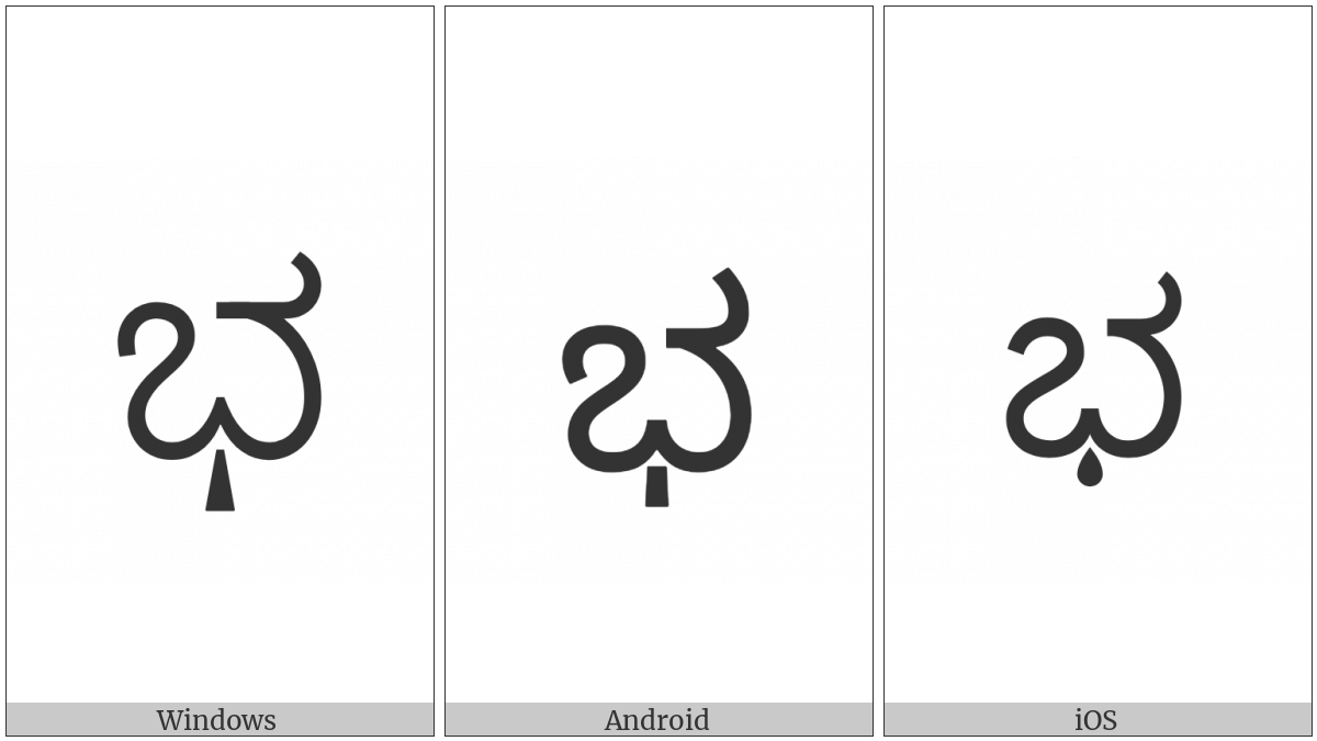 The image below shows how the “Kannada Letter Bha” symbol might look like on different operating systems. If the font in which this web site is displayed does not contain the symbol and there is no fallback font able to render it, you can use the image below to get an idea of what it should look like.