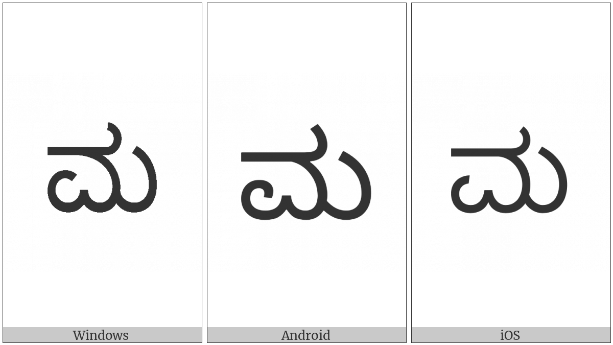 The image below shows how the “Kannada Letter Ma” symbol might look like on different operating systems. If the font in which this web site is displayed does not contain the symbol and there is no fallback font able to render it, you can use the image below to get an idea of what it should look like.