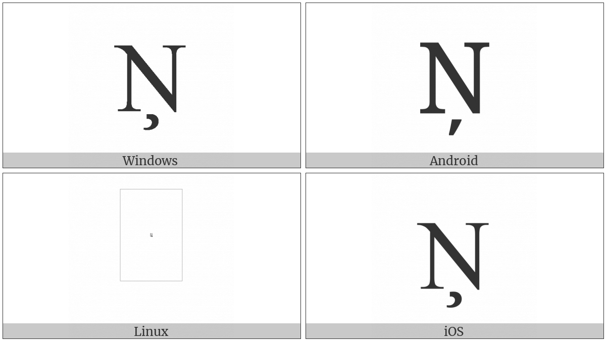 The image below shows how the “Latin Capital Letter N With Cedilla” symbol might look like on different operating systems. If the font in which this web site is displayed does not contain the symbol and there is no fallback font able to render it, you can use the image below to get an idea of what it should look like.