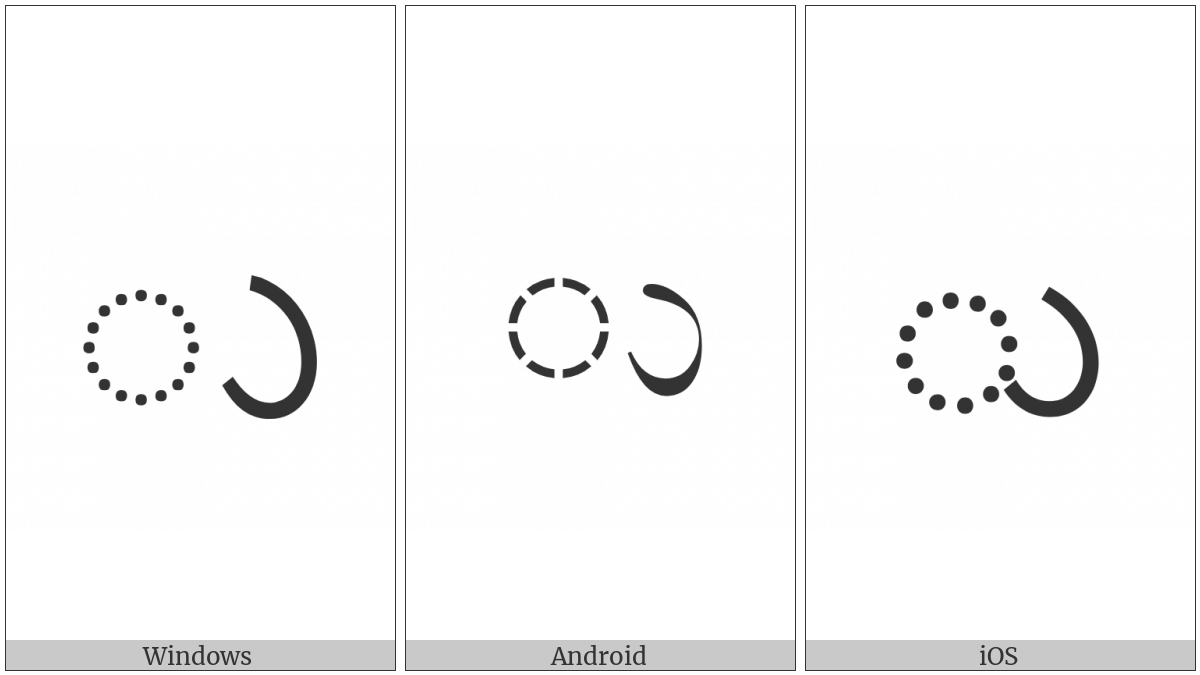 The image below shows how the “Kannada Vowel Sign U” symbol might look like on different operating systems. If the font in which this web site is displayed does not contain the symbol and there is no fallback font able to render it, you can use the image below to get an idea of what it should look like.