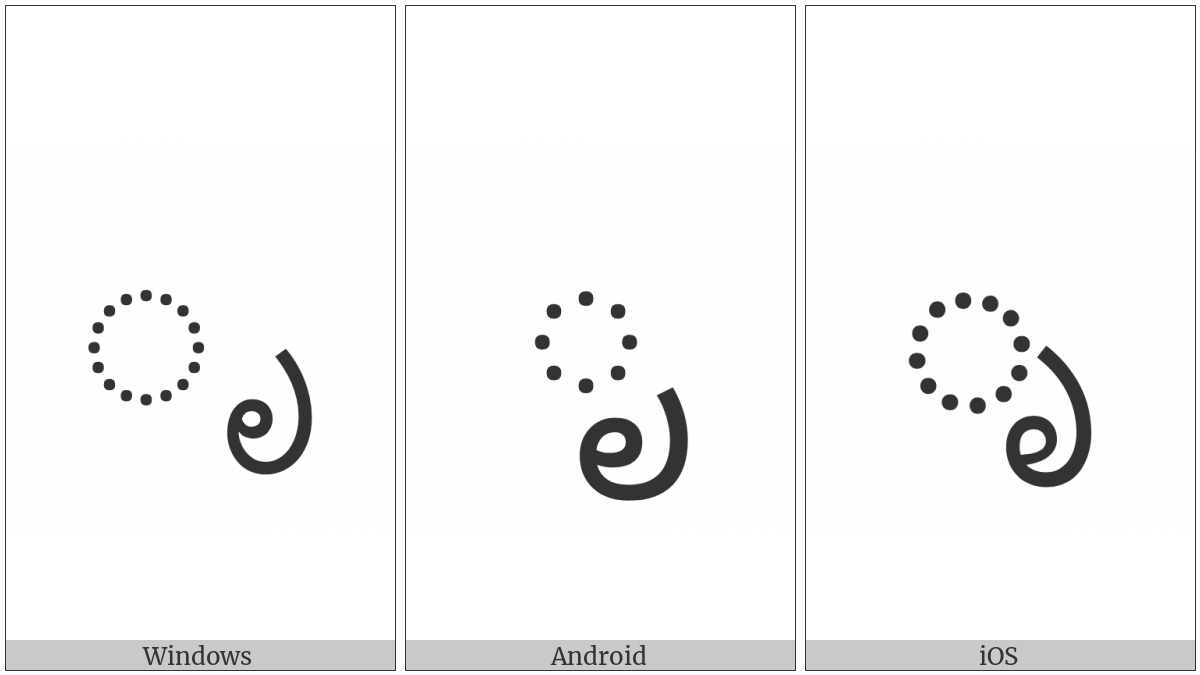 The image below shows how the “Kannada Vowel Sign Vocalic R” symbol might look like on different operating systems. If the font in which this web site is displayed does not contain the symbol and there is no fallback font able to render it, you can use the image below to get an idea of what it should look like.
