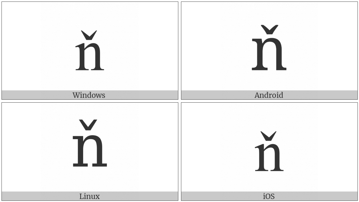 The image below shows how the “Latin Small Letter N With Caron” symbol might look like on different operating systems. If the font in which this web site is displayed does not contain the symbol and there is no fallback font able to render it, you can use the image below to get an idea of what it should look like.